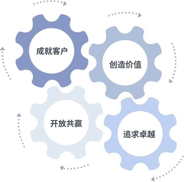 成就客户是一切决策的出发点,,,,创造价值是衡量所有工作的标准,,,,追求卓越是我们做事做人的态度,,,开放共赢是我们的格局也是最终的结果。。。。价值观的齿轮环环相扣,,推动着组织里的每个人不断向前。。。。