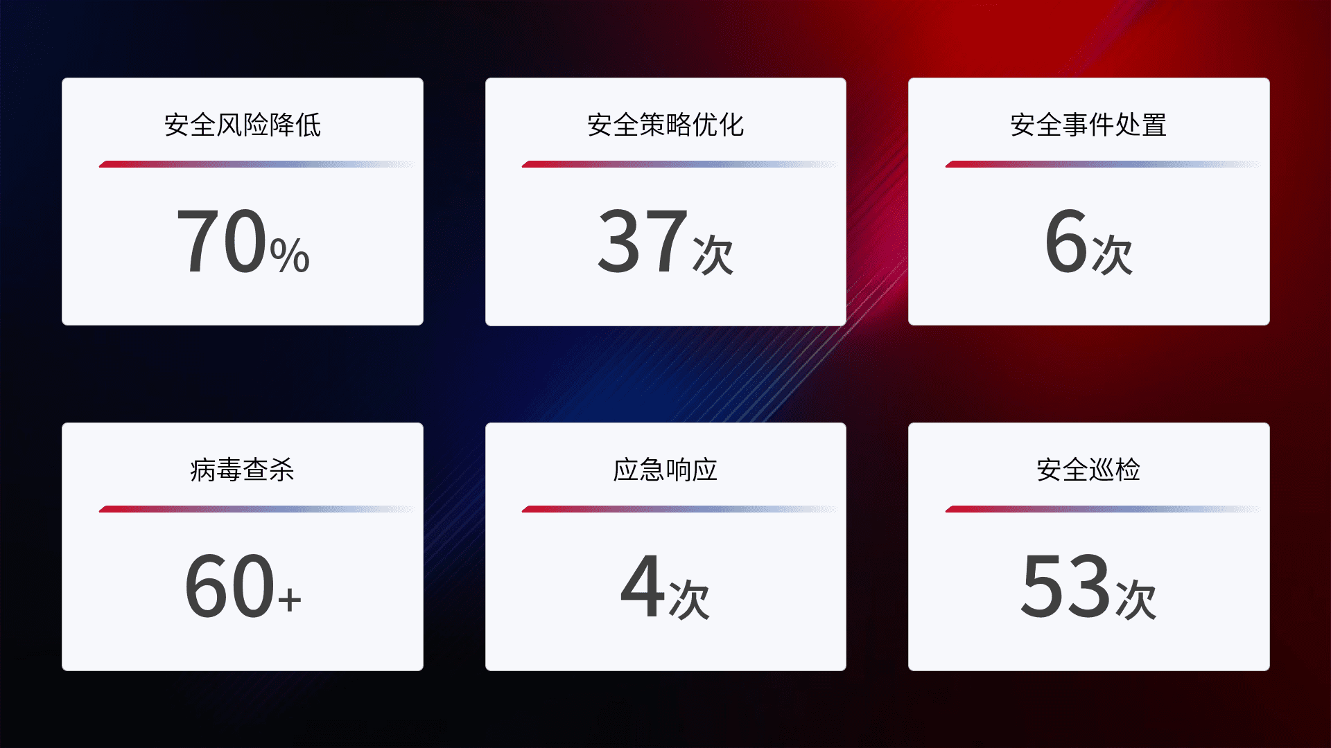 提供全面的安全事件报告体系,,,,包括处置报告、、周报、、季度和年度总结,,,结合持续监控,,,帮助客户深入了解网络安全状况。。