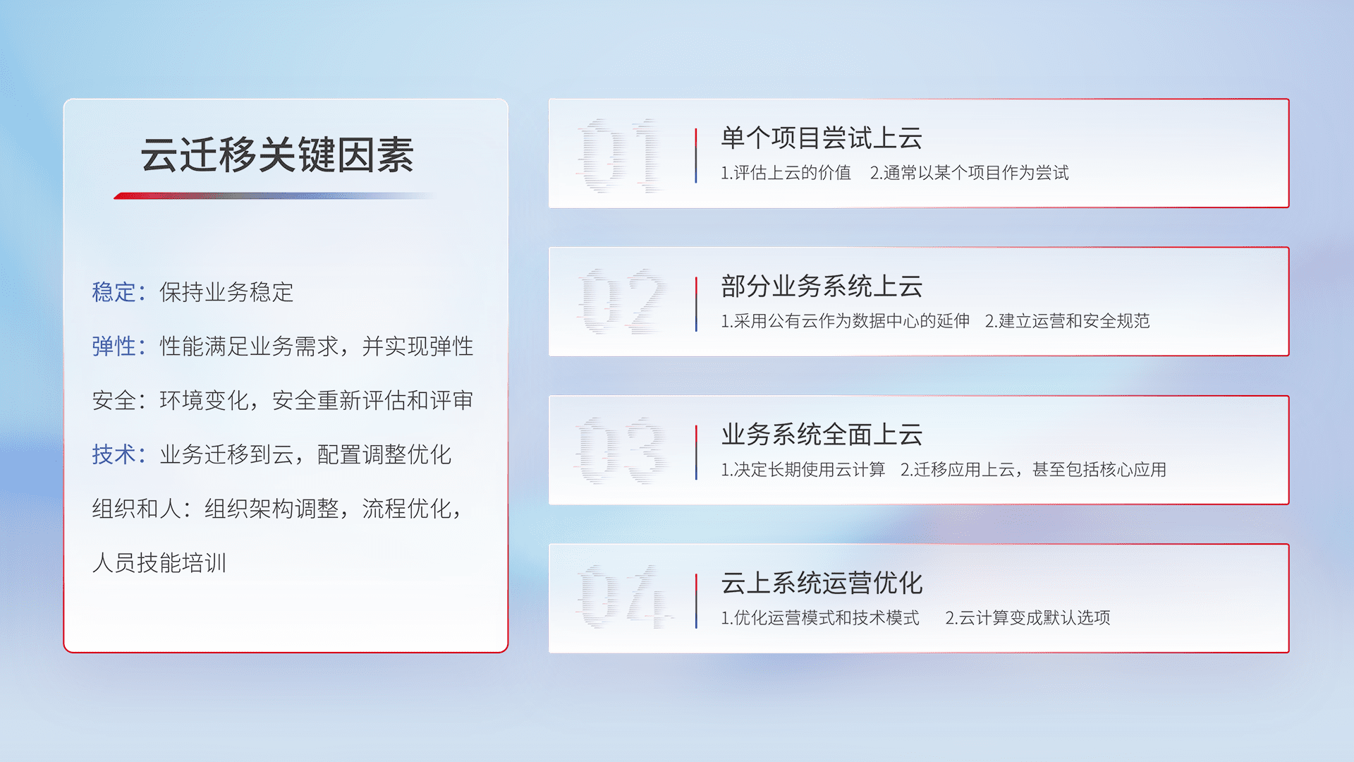 结合实际业务,,,,从规划设计、、云平台选型、、云原生改造、、、、数据迁移、、、、集成交付,,,,迁移全过程为客户识别最佳上云路径,,,做好风险识别管理,,,设计网络架构、、身份权限、、、、安全审计合规、、操作审计、、、、日志审计、、、、监控告警策略、、、、多站点容灾设计等,,对云上基础设施进行整体规划,,,,提升IT治理水平,,,,以满足弹性、、高可用、、、、高性能的需求。。。
