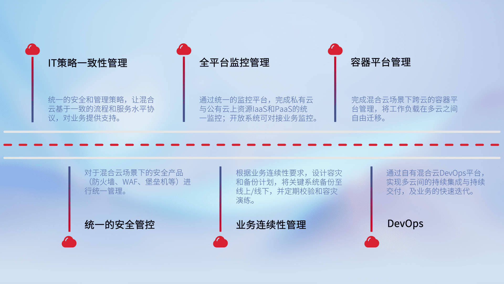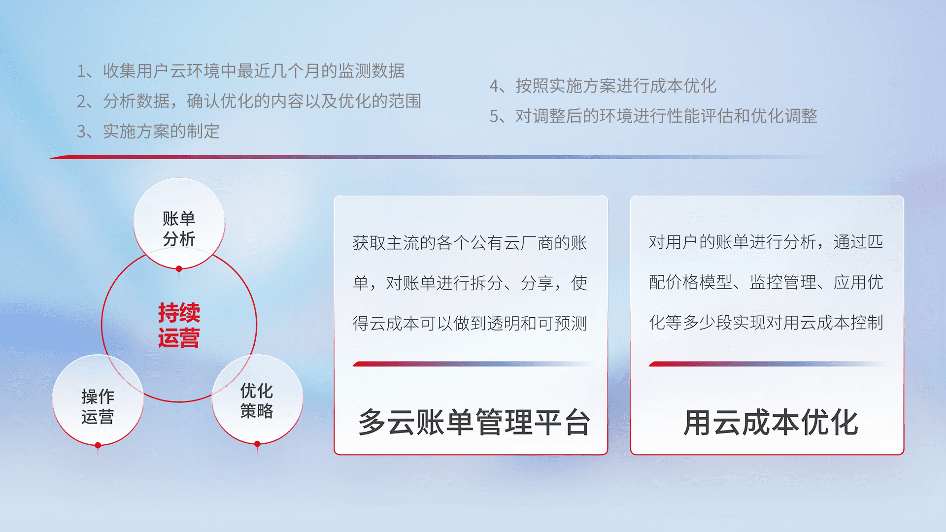 通过多云纳管,,以统一的资源数据模型把客户的云资源进行抽象和封装,,,进而实现对多云资源的统一操作,,,,保障云资源管理的可靠性、、、、稳定性与可用性。。。量身定制化运维内容,,,配置、、、、开发运维、、补丁管理、、备份、、、监控、、、认证和访问管理、、、审计和日常巡检等,,保障在用云过程中的可靠度,,,稳定度以及高可用率。。。。