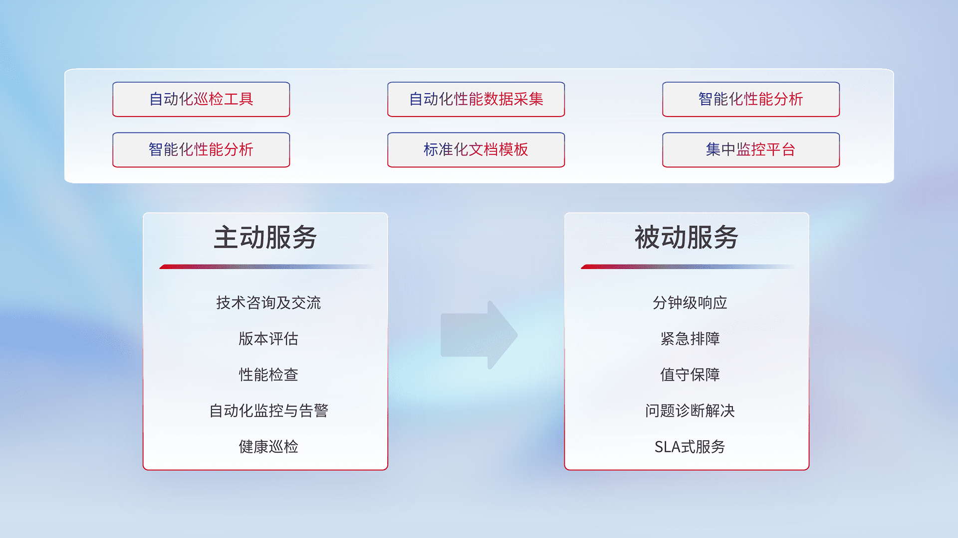 智能化工具和标准化文档,,,,保障服务质量,,,提供主动服务(包含技术咨询、、、、版本评估、、性能检查、、、自动化监控与告警、、健康巡检)和被动服务包含(分钟级响应、、、紧急排障、、、值守保障、、、问题诊断解决、、、、SLA服务)。。。